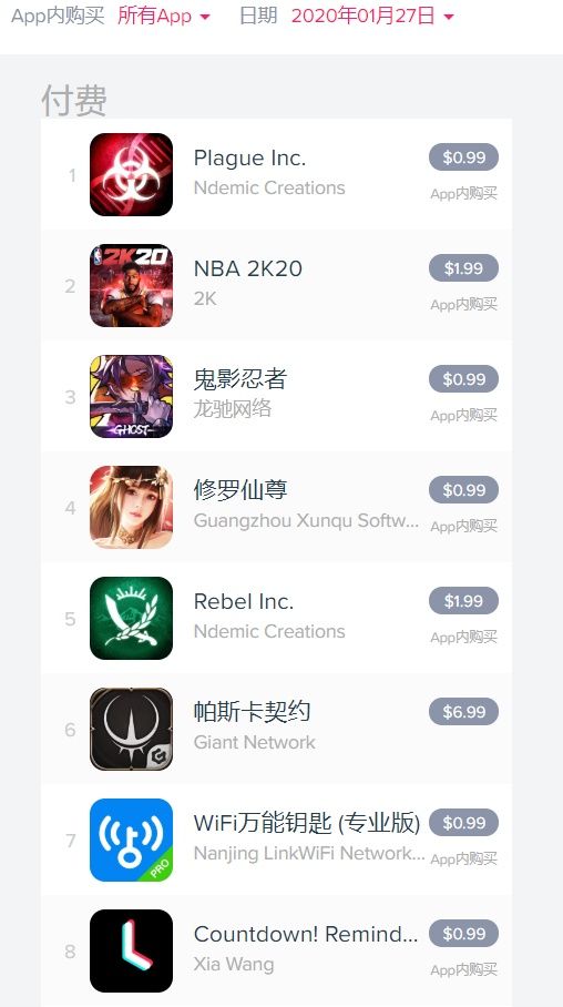 本次新型冠状病毒疫情的爆发也让8年前的旧作《瘟疫公司》重新大热,这款由英国游戏工作室Ndemic Creations开发的策略模拟游戏近日在中国、英国、美国等多个国家热销,活跃玩家激增,根据Sensor tower和App annie平台数据显示,《瘟疫公司》位列App Store付费榜榜首,在1月18日之后人气飞涨,开始急剧攀升。