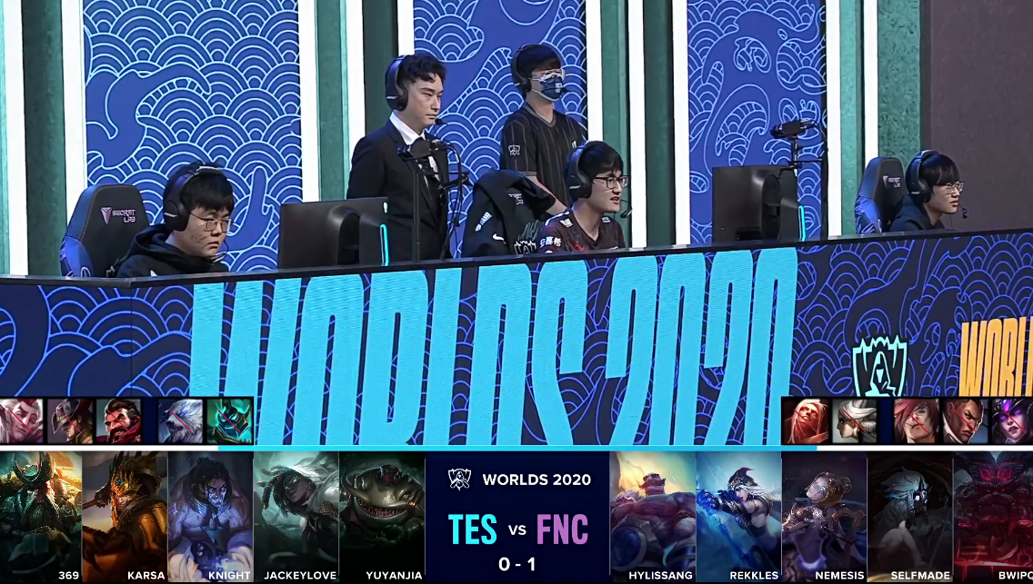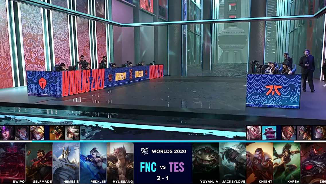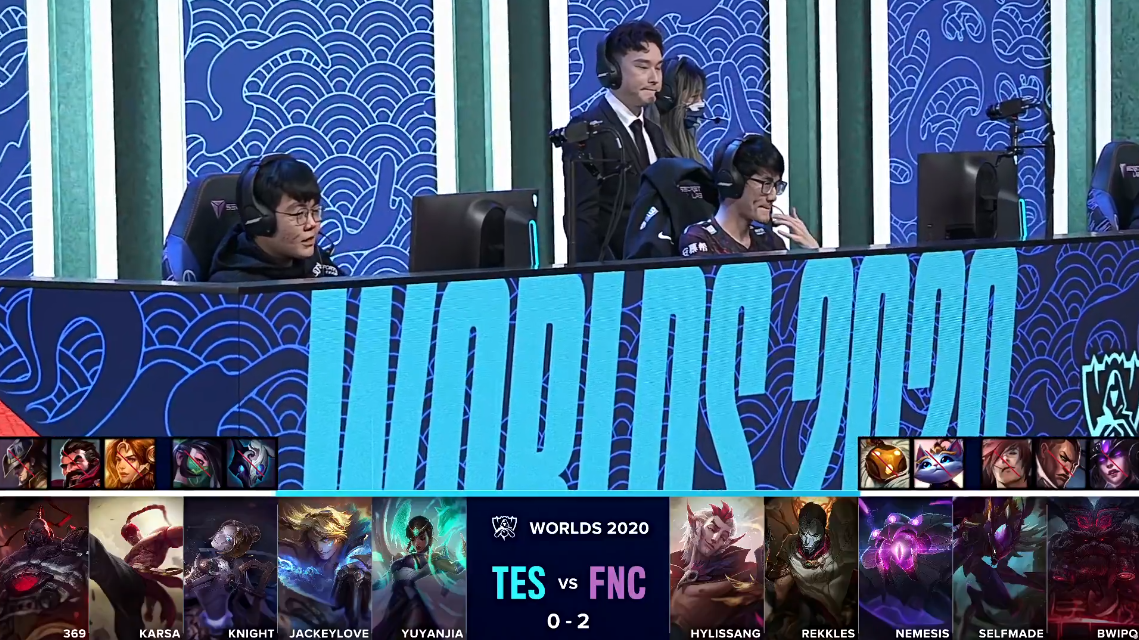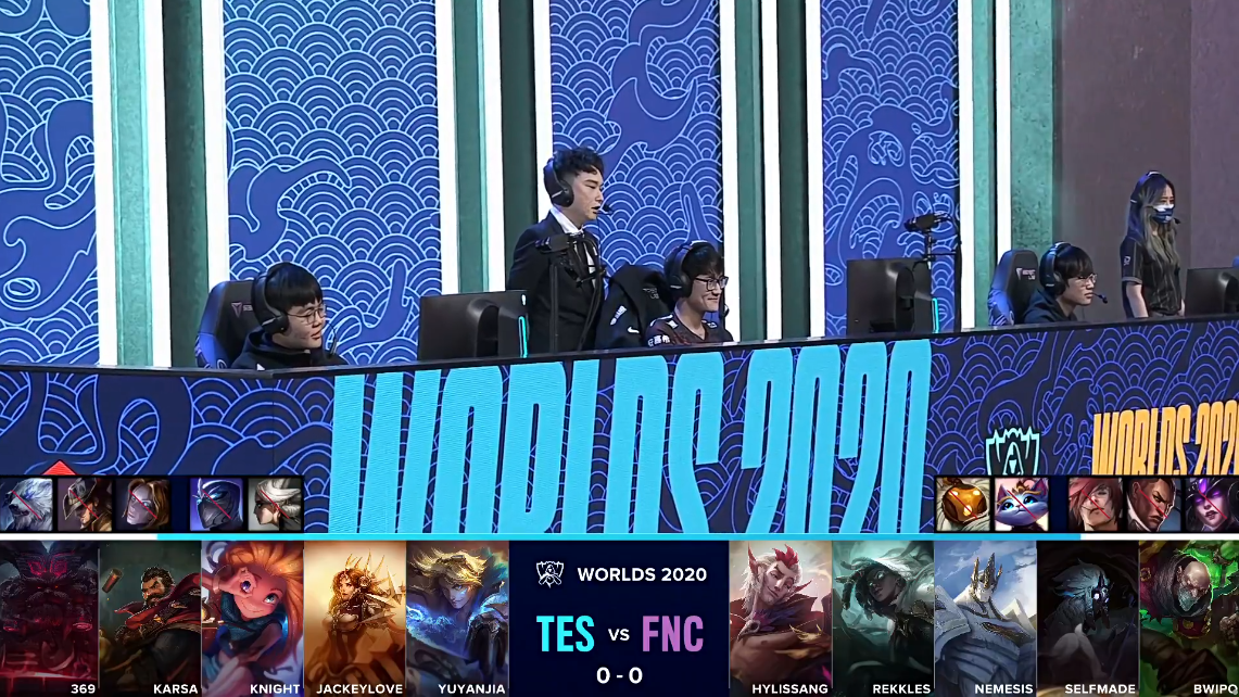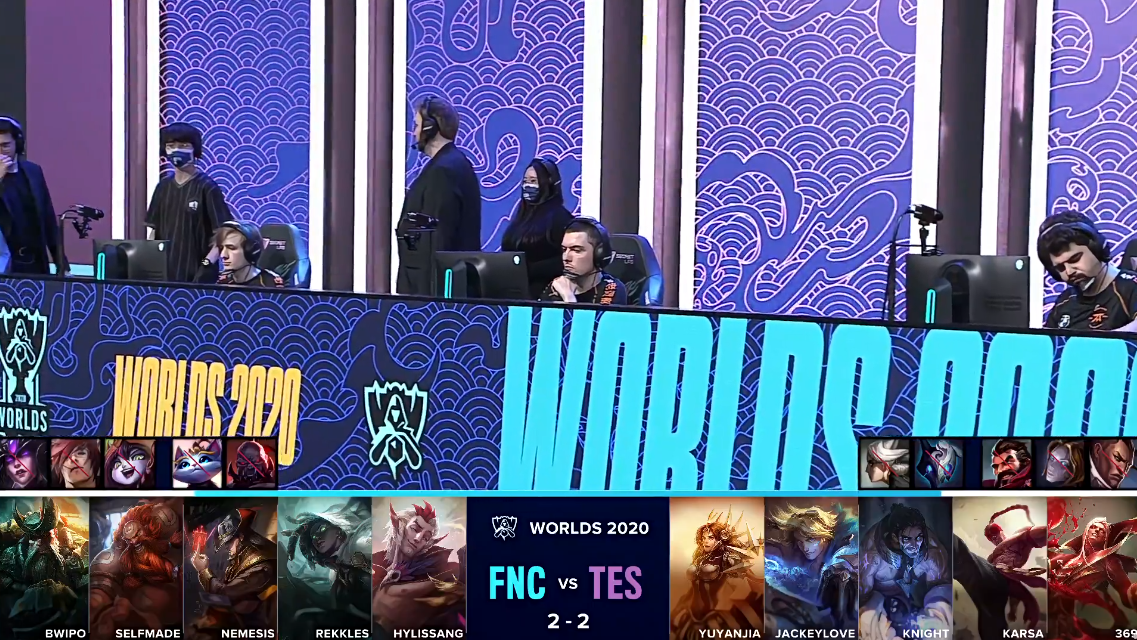 双方进入TES“生死局”,在“生死局”中,TES拿出了前期非常强势的上野以及双人路组合,而FNC则是再一次拿出了本届全球总决赛自己还未使用过的打野螳螂以及中单维克兹。