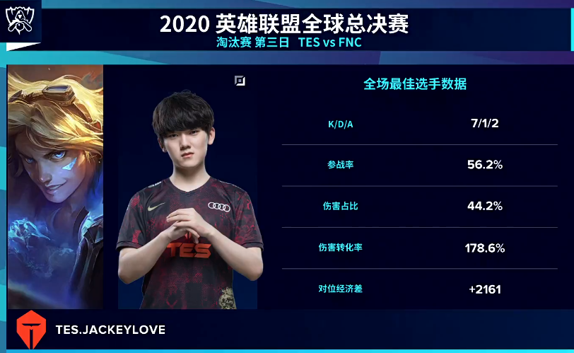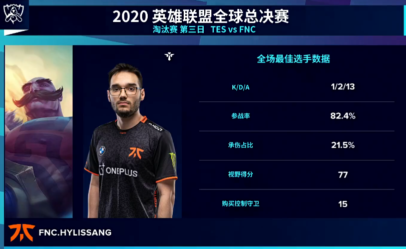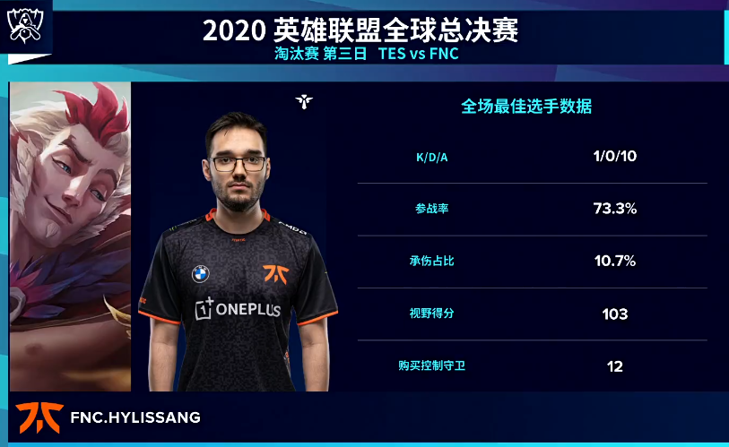 而就在TES无法找到节奏的时候,FNC却凭借着辅助洛以及炼金的绕后不断寻找机会给到了TES非常大的威胁。最终,FNC也是凭借着出色的抓机会能力将雪球越滚越大,直接是赢下了第一局的比赛。与此同时,在这一场比赛中不断抓到机会的辅助选手Hylissang则是获得了本场比赛的MVP。