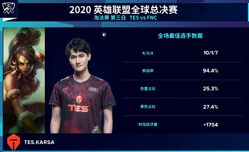 不过,也正是Karsa的这一手自信的盲僧,直接是成功压制住了FNC的中单卡牌。伴随着卡牌不断遭遇到压制与“击杀”,其实也是让FNC这边的中野节奏全无。而随后TES的中野也是不断帮助队友滚起雪球。最终,TES终于再次成功击败FNC,完成让二追三。而在这一场比赛中,成功凭借着盲僧压制住FNC中野的Karsa也终于也是拿到了MVP。