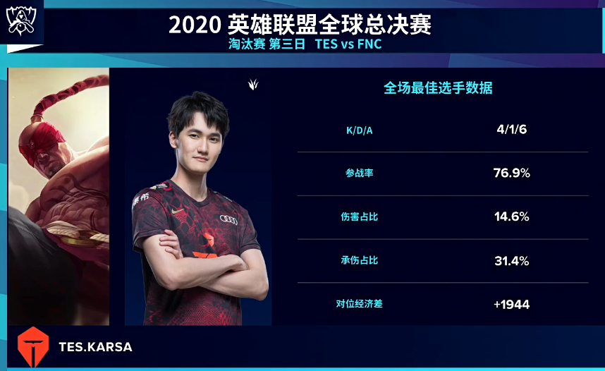 而在TES完成让二追三之后,打野选手Karsa也是首次在全球总决赛中突破了八强的魔咒,成功晋级四强。并且,在最后的关键局中,也是Karsa凭借着盲僧这个英雄实现了自己的突破。