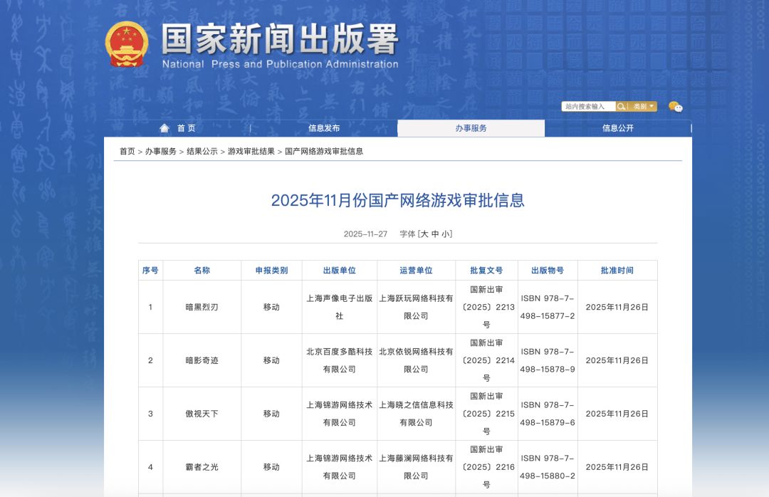 游戏版号数再创新高!11月共184款发布,完美世界、B站在列
