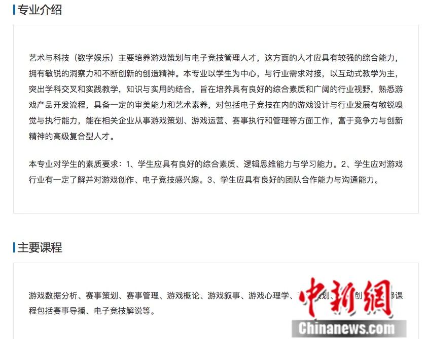 “其实,大学里的专业可不是教学生玩游戏。”张兆弓说,以他所在的中国传媒大学为例,设置的专业名为“艺术与科技(数字与娱乐方向)”,大学系统性培养能够让学生毕业时自由选择电竞设计、策划、管理或运营。