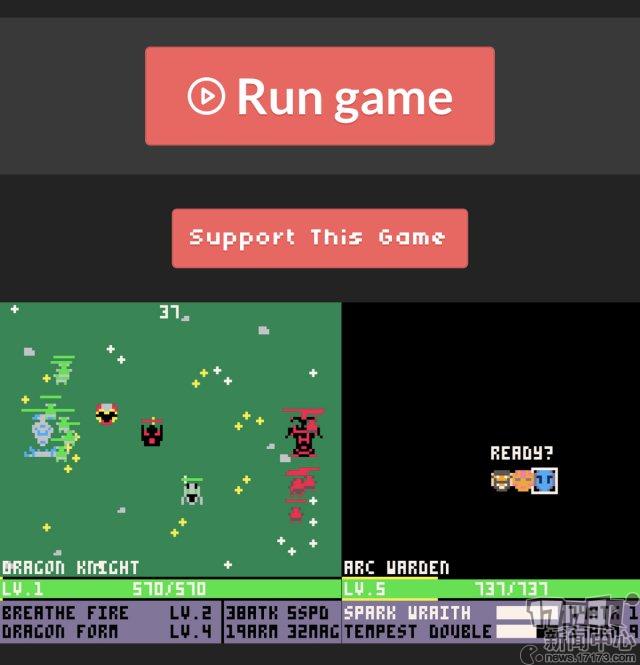 打开作者自制游戏的网页链接,是熟悉的8位游戏画风。玩家可以点击“Run gam”运行游戏,再点击右边小按钮能全屏游玩。下拉会有关于游戏玩法,英雄及技能介绍等内容。